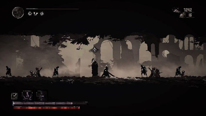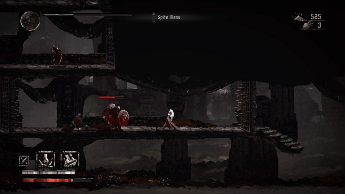En termes d’exploration, Moonscars nous fait penser à un Castlevania SOTN ou un Hollow Knight. Certaines zones vous seront, au début, inaccessibles et il vous faudra trouver un autre passage ou un objet vous permettant de continuer dans telle ou telle direction. Plateformes, leviers, pièges, passages secrets, tout y est pour satisfaire votre curiosité d’explorateur, et ce côté-là du jeu est à mon sens bien réussi. La carte est cependant un peu confuse et nous aurions aimé pouvoir zoomer un peu plus et y voir avec un peu plus de clarté, les tons noirs, gris et blancs n’aidants pas beaucoup à la navigation.