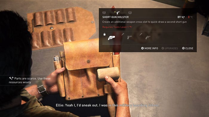 Ici et durant les heures suivantes, le jeu passe à la vitesse supérieure et beaucoup de nouveaux éléments sont introduits : les armes à feu et la possibilité de les « upgrader », les vitamines que vous pourrez trouver dans le monde pour acheter des compétences, et le « craft » qui vous permettra en récoltant des objets de fabriquer cocktails Molotov, couteaux et autres équipements utiles. Evitons encore une fois les spoilers, mais Joel et Tess se verront confier une mission d’escorte un peu spéciale, puisqu’il s’agira d’amener une adolescente porteuse d’un secret — Ellie — à un endroit bien spécifique…