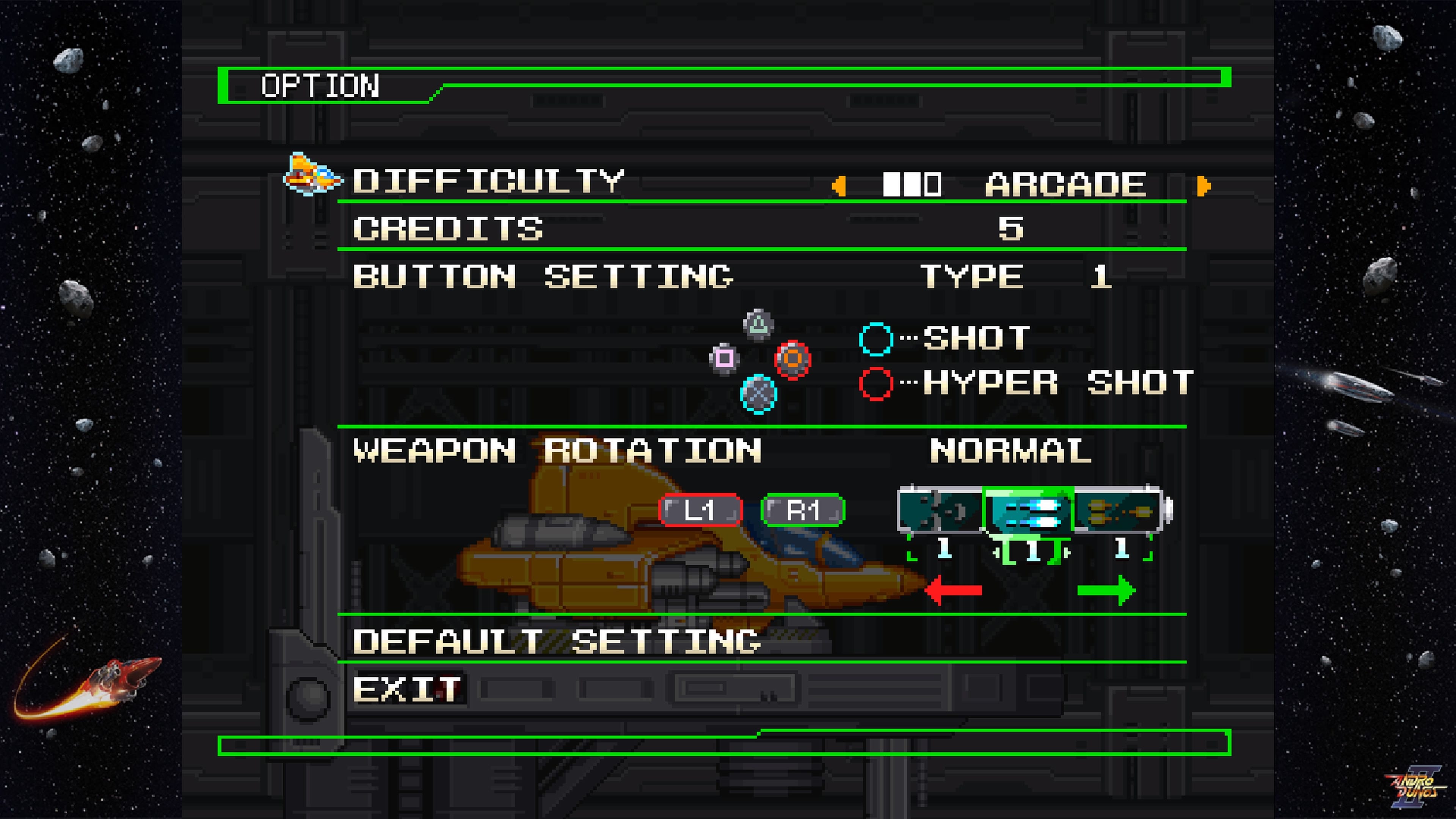 Pour les puristes comme moi, je peux vous dire que ce portage est une pure merveille. C’est avec un plaisir immense que j’ai lancé Andro Dunos II. A l’époque, (quand on était jeune) Visco était le champion des shoot’em’up ou des SHMUP (contraction de Shoot Em Up) et cette version 2022 est brillamment reprise par des développeurs de talents que sont PixelHeart et Picorinne Soft. On ne présente plus ces studios de renom qui régalent à chaque sortie de jeu. C’est avec confiance que j’allume ma ps5 pour tester l’un de mes shoots préférés.