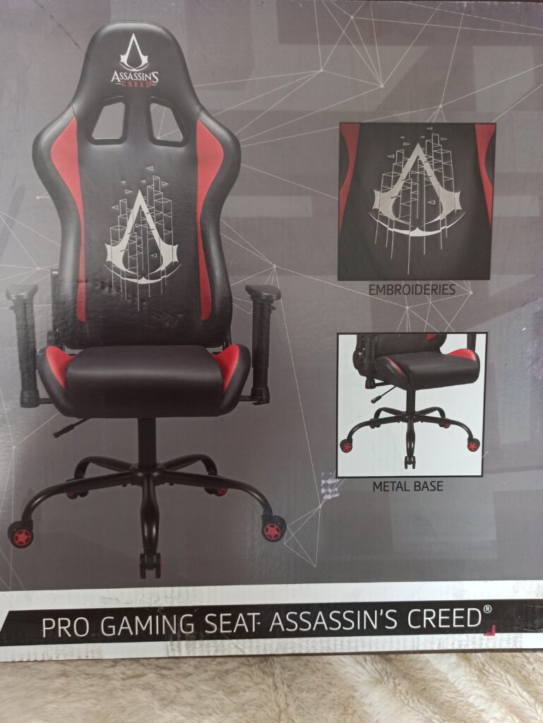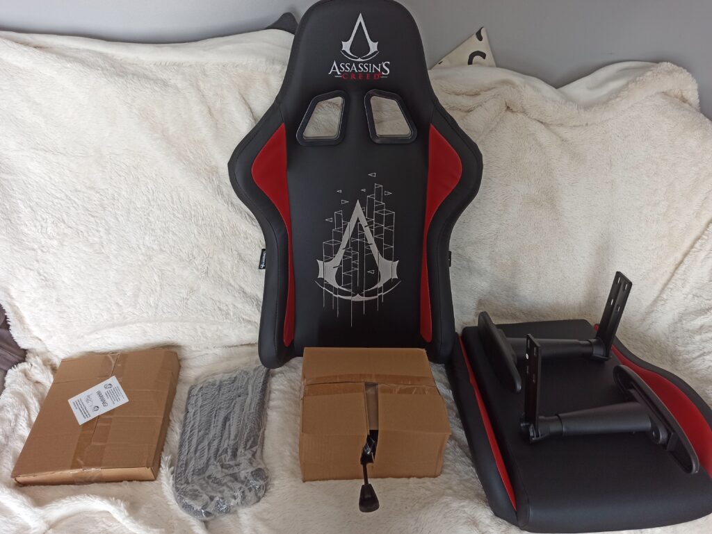 Reçue dans son carton estampillé Assassin’s Creed « Official licence by Ubisoft », c’est avec une certaine émotion que je commence doucement à ouvrir le colis. Toute vêtue de noir avec des pointes de rouge – tel les couleurs d’un assassin à la lame secrète – je m’apprête à sortir de son écrin le dossier ainsi que l’assise. Je sens sous mes mains la qualité immédiate des matières. J’ai hâte de la monter pour profiter de ce confort que je devine déjà.