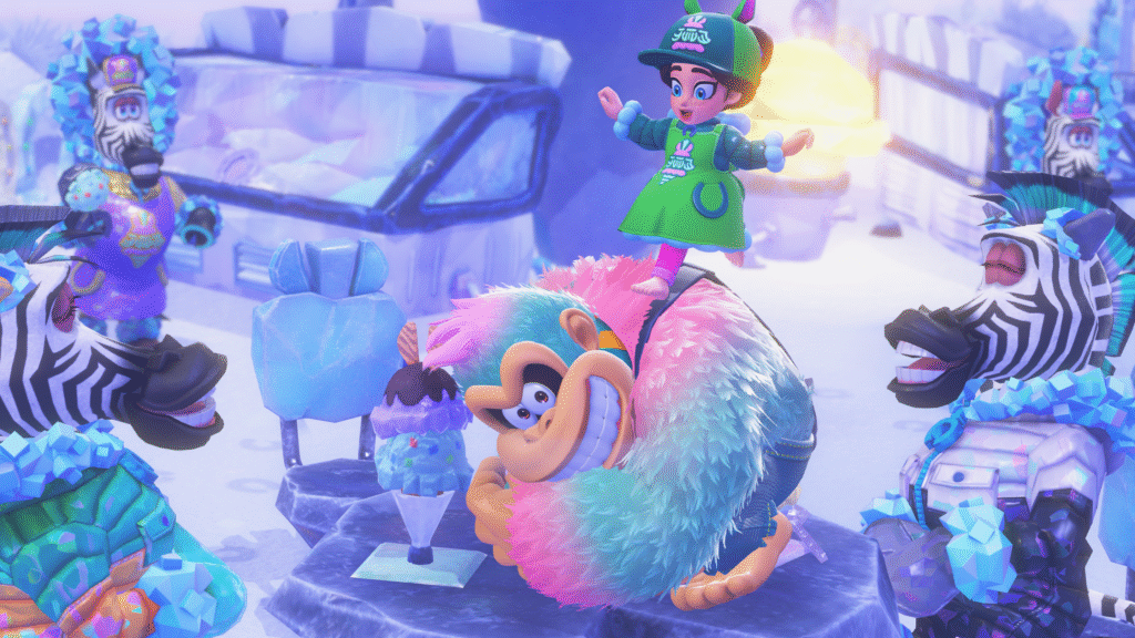 Donkey Kong Bananza peut se jouer solo ou en coopération avec un ami. Les attaques vocales de Pauline se déclenchent avec la fonction souris du Joy-Con 2. Il est également possible d’utiliser GameShare pour partager le jeu et jouer en coop local avec un autre joueur, même si ce dernier ne possède pas le jeu. En plus du partage local sur une console Nintendo Switch 2, vous pouvez aussi partager le jeu avec une autre console en local. En outre, il est possible d’inviter des amis en ligne à rejoindre une session de jeu par chat vocal ou vidéo avec GameChat.