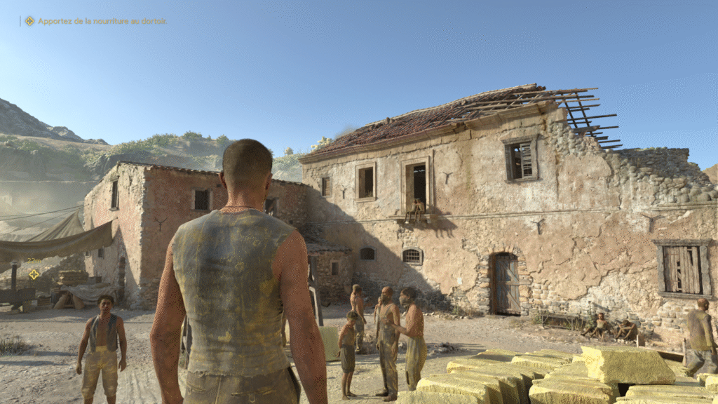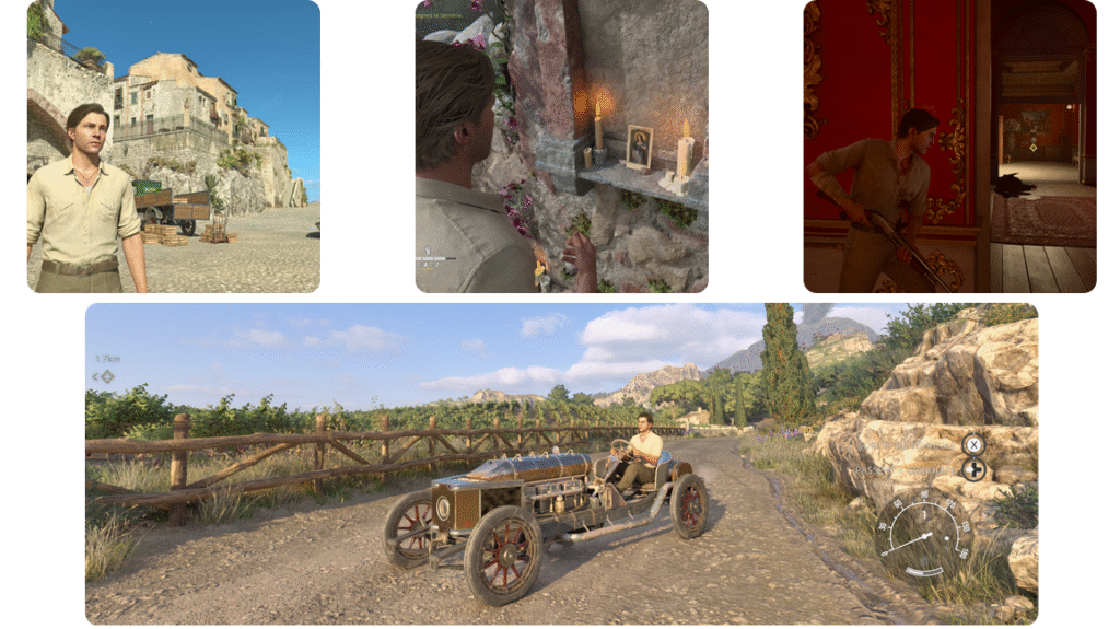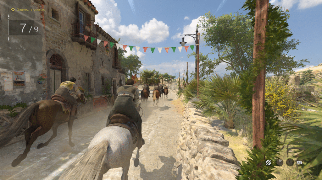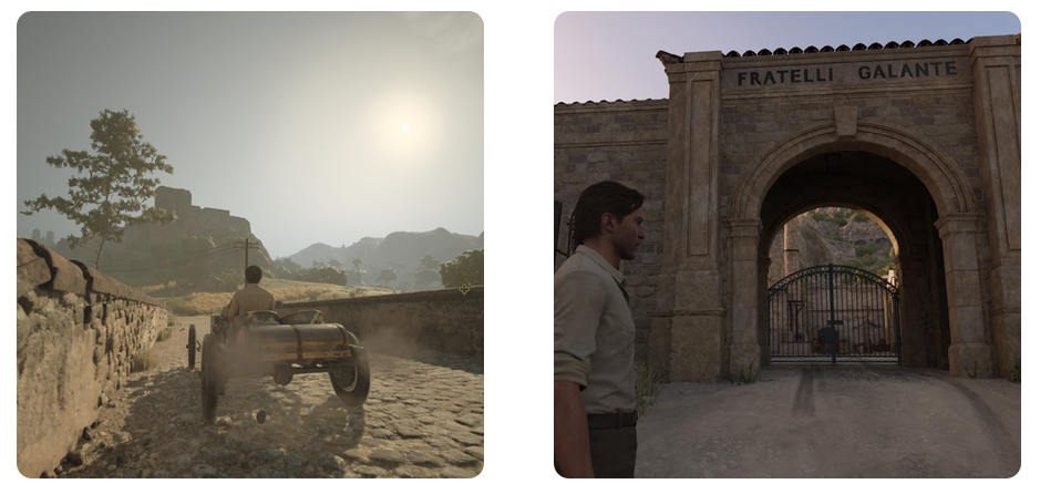 Notre aventure nous mène à travers de jolis paysages. Des champs de lavande à perte de vue, des chants de cigales reconnaissables entre mille et des domaines viticoles sans compter. Enzo va devoir, sous les ordres de Don Torrisi, mener à bien des missions qui ne seront… pas très « correctes » pour étendre le pouvoir de la famille. A cheval, en voiture ou bien à pied, c’est un vrai plaisir visuel que nous livre Mafia The Old Country. Les graphismes sont vraiment très propres. Les détails fourmillent, que ce soit en extérieur ou en intérieur. Les passages dans les villages à flanc de colline sont très beaux. On peut y voir la vie paisible des habitants et leurs animaux de compagnie. Si on prend le temps de bien observer en profondeur ces détails on voit des incrustations dans la pierre devant les boutiques, des reflets plus que concluant dans les flaques (et ma smartTV ne fait pas le raytracing) … Vous l’aurez compris j’en ai pris plein les yeux !