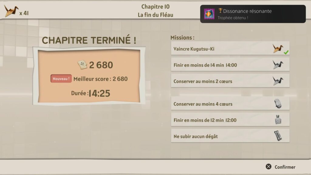L’articulation du jeu se fait comme suit : chaque monde est représenté par 2 niveaux. Par exemple, le chapitre 1 est divisé en niveaux 1-1 et 1-2. Le tout est divisé en niveaux et le dixième ne sera accessible qu’à partir du moment où vous allez récupérer 4 grues (Origami). Vous allez me dire : mais comment on récupère ces fameuses grues ? Chaque niveau vous proposera des défis primaires et secondaires. Les primaires sont souvent :