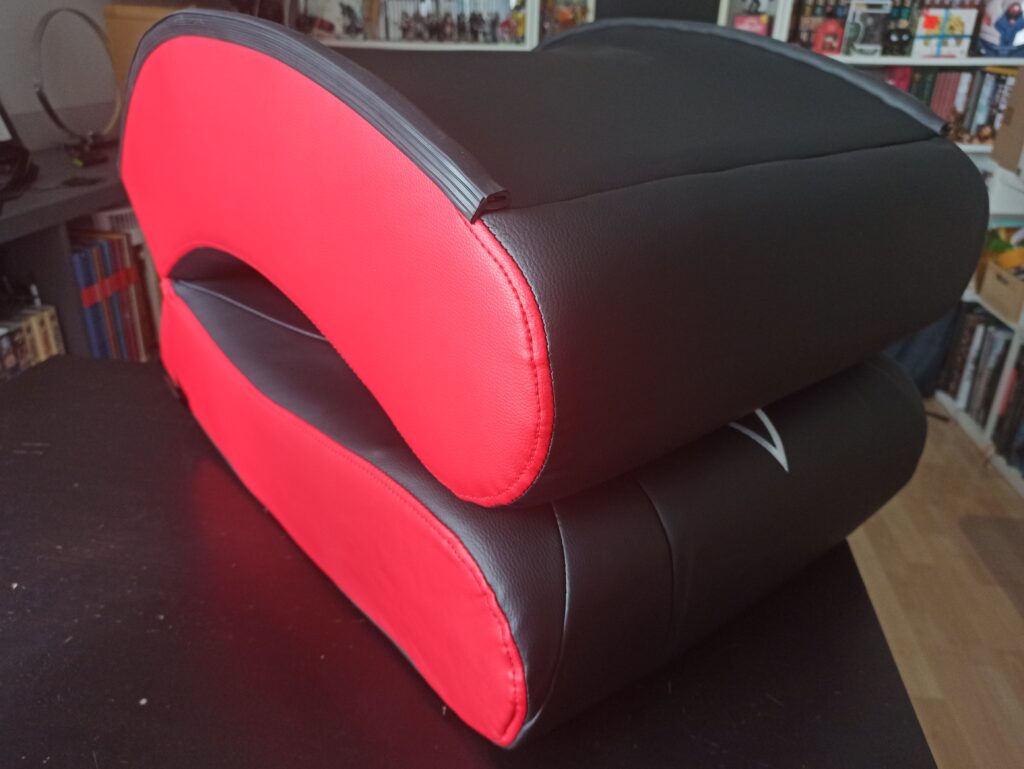 – Si vous vous asseyez avec le bassin bien plaqué au fond du siège et plutôt assis « carré », vous allez vous apercevoir que votre tête ne repose pas complètement sur l’appui-tête. Cela peut causer une gêne après de longues minutes en sachant que vous jouez avec une console portable dans les mains, donc la tête dirigée vers le bas. Ma compagne mesurant 1.50m, elle se tient parfaitement dans le siège et sa tête repose à 100% sur l’appui-tête. Elle était confortablement bien assise et son expérience de jeu était très bonne. Pour moi mon expérience était tout aussi bonne mais avec une manette en main et mon regard dirigé vers la TV qui se trouve sur un meuble de 80cm de haut environ. Ma tête était donc légèrement inclinée vers le haut et la position était parfaite.