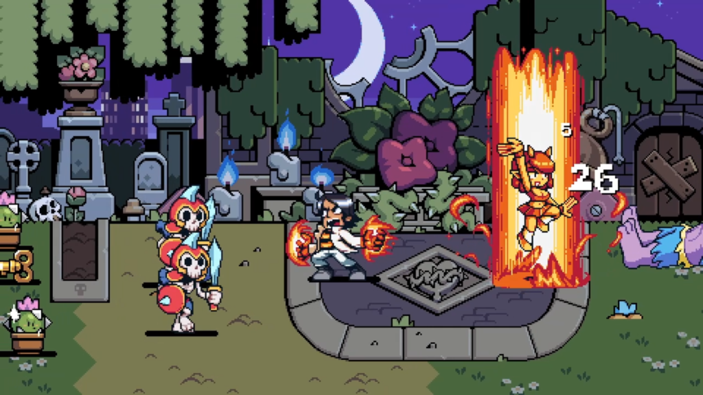 Battez-vous à travers ce Toronto sauvage aux couleurs éclatantes, largement inspiré des jeux vidéo de la licence et constellé de références appuyées à l’univers, pour accomplir des quêtes et dominer les gangs qui règnent sur les différents quartiers de la cité. Les ennemis peuvent être éliminés à l’aide des capacités uniques et évolutives de chaque personnage, ou grâce aux nombreux objets différents trouvés au hasard des environnements hautement interactifs du jeu. On parle notamment d’une batte de baseball, d’un bâton démoniaque, de navets et bien d’autres surprises. Avec sa toute nouvelle histoire co-écrite par Bryan Lee O’Malley et l’équipe de Tribute Games, en plus de pistes musicales exclusives signées par le spécialiste de la licence Anamanaguchi, Scott Pilgrim EX offre à la série un nouveau chapitre plein de panache, taillé pour les fans de la première heure comme pour les néophytes.